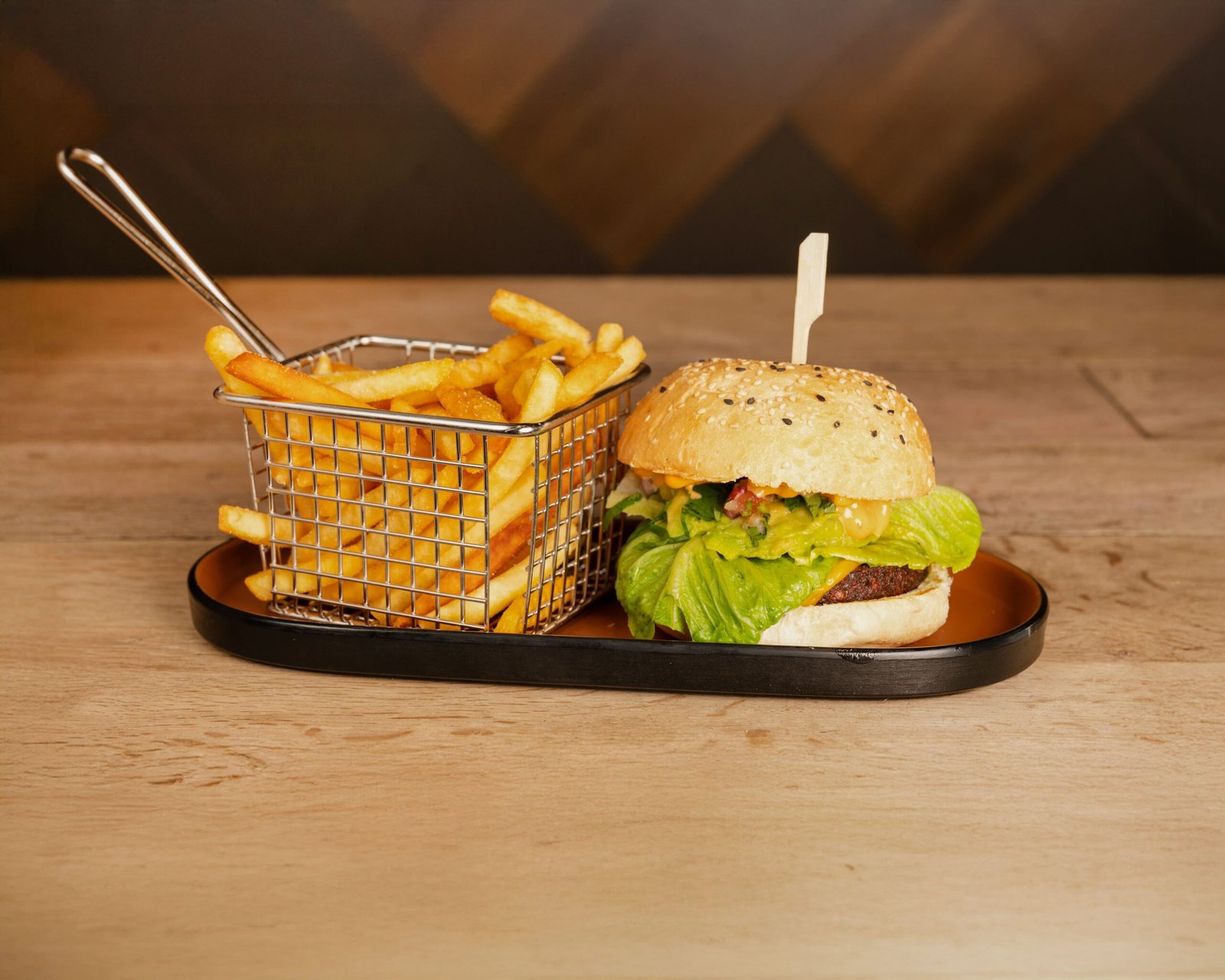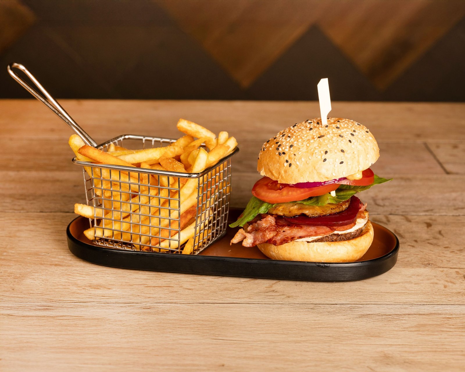 We offer grass-fed beef burgers, fried chicken burgers, flame-grilled chicken burgers, double patties, and vegan options.
